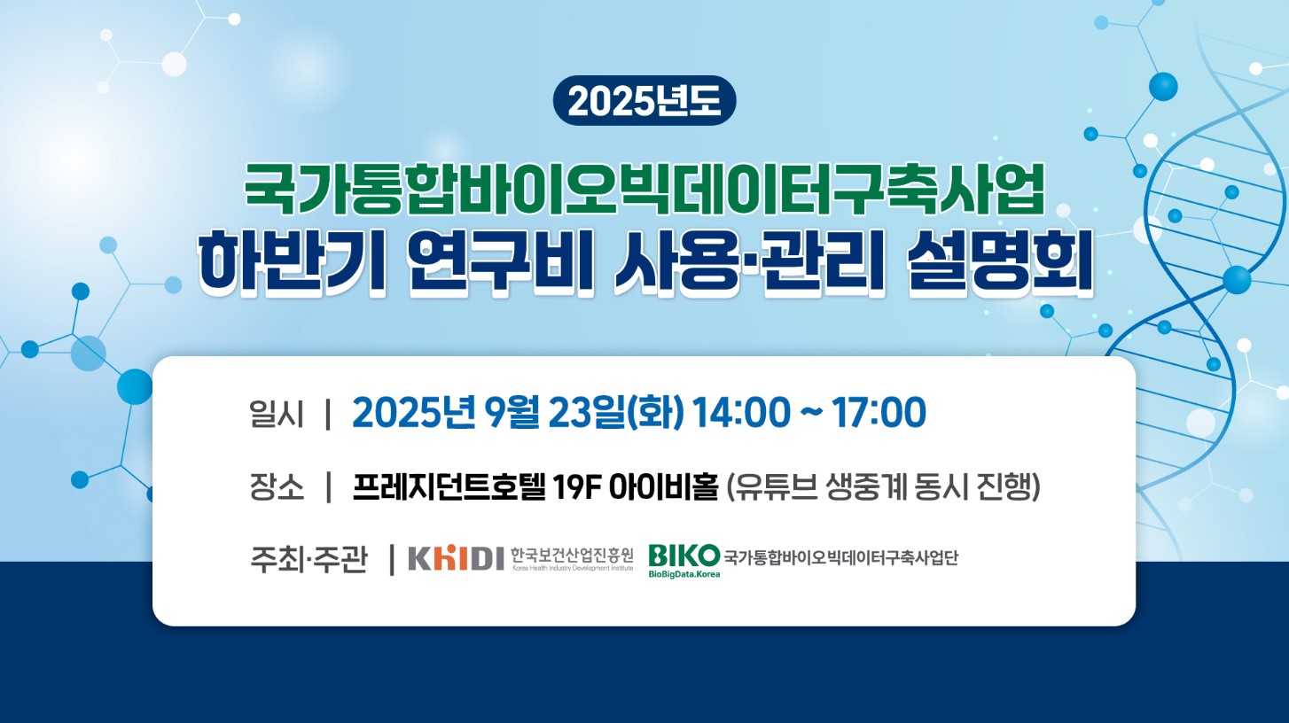 2025년도 국가통합바이오빅데이터구축사업 하반기 연구비 사용·관리 설명회(25.9.23) 영상 작성자 관리자 작성일 2025-09-29 조회수 222 2025년도 국가통합바이오빅데이터구축사업 하반기 연구비 사용·관리 설명회(25.9.23) 영상 ※ 영상 보기 (상기 이미지 클릭)