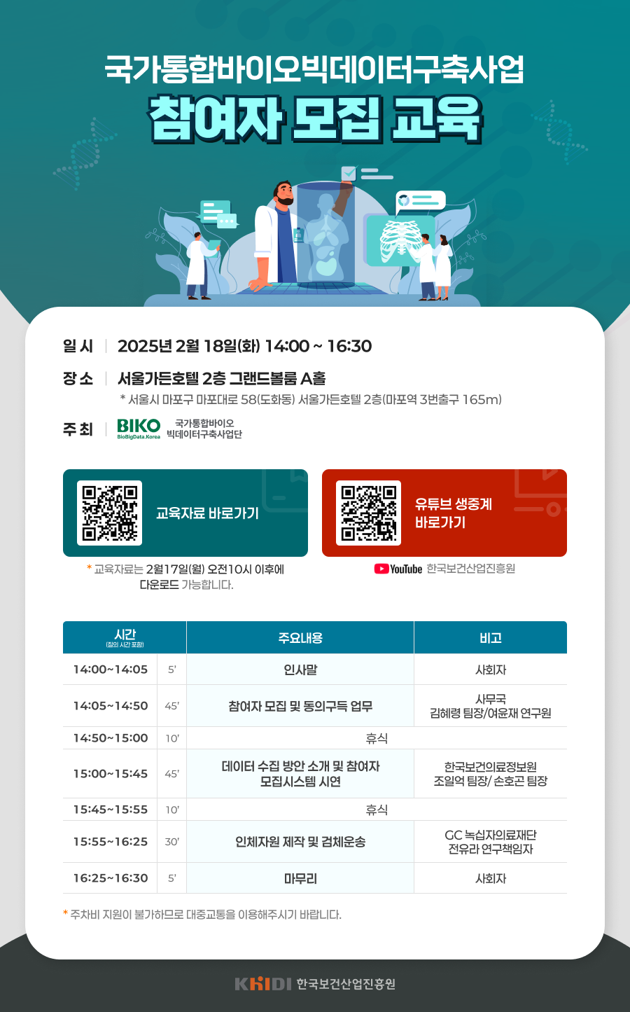 국가통합바이오빅데이터구축사업 참여자 모집 교육(25.2.18) 작성자 관리자 작성일 2025-02-05 조회수 3,185 첨부파일 (250218)국가통합바이오빅데이터구축사업 참여자 모집 교육 교육자료.pdf (29.63 MB) 다운로드 (수정최종본) 인체자원 제작 및 검체운송_GC 녹십자 의료재단_250218.pdf (4.71 MB) 다운로드